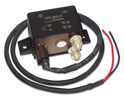 Dual Battery Systems (URA) are intended for automatic ON/OFF of the reserve battery and decoupling of the main and reserve batteries. They provide autonomous operation of the batteries. This allows to use one of the batteries when the engine is not operating for additional devices feeding (music, chiller, etc.) This prevents the main battery from discharging. Dual Battery Systems can be used on the cars and 12V ships and boats. URA 200 and URA 300-01 are power relays with integrated microcontroller.The reserve battery is switched ON/OFF automatically as soon as the main battery voltage reaches ≥13,2В and ≤12,8В correspondently and holds it within 6 seconds. Forced ON switching of the reserve battery is possible by usage of “start” clamp. In higher humidity conditions it is recommended to use URA 200 and URA 300-01. One should make outline cover waterproof protection first. URA 300-01 includes counterpart slot with 1 meter length cable. URA 400 is a high capacity bistable relay connected to the control unit. Control unit indicates batteries voltage level and controls relay operation. Manual installation of switching levels and indication mode of the reserve battery operation are possible in URA 400.
